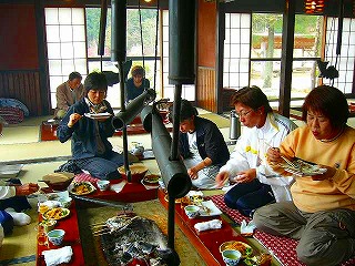囲炉裏囲んで笑顔弾け、魚、五平餅が美味しい!そんな一時を、皆で共有できる至福の山里! しらかばコース 2100円 五平餅2本 あまご・いわな塩焼・ あまご汁 南蛮漬 漬物 |