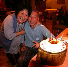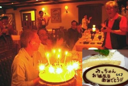 ![]() 突然明かりが落とされた!ハッピーバースデーの歌と共にケーキが運ばれる。サプライズであった! 嫁とテニス仲間に感謝をし、嬉し恥ずかしの夜になった。 |