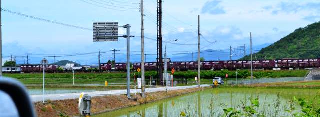 ![]() JR貨物が田植えを終えた田んぼを挟んで、走り去って行く。 米原JCT付近 |