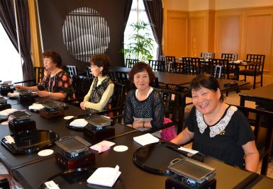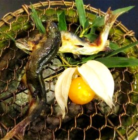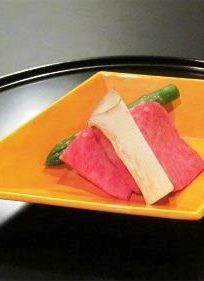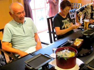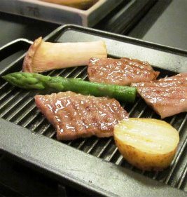 ![]() 「黒毛和牛」鉄板焼き 肉の食べれないMasamiさんは「鮎とホオズキ」の炭火焼き |