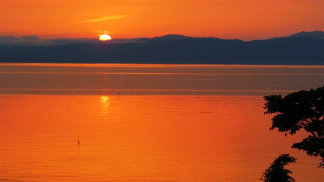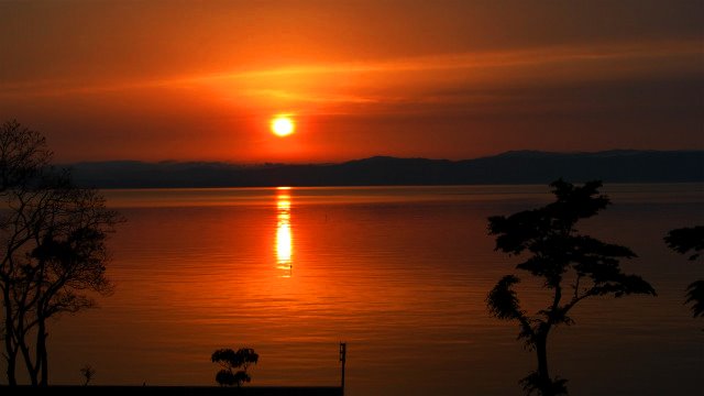 ![]() 18:30 対岸の高島市「比良山地」に沈む夕陽を、琵琶湖に映す! XIVの日本料理「日本海」からの眺め、しばし箸を休め見とれる。 |